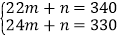 ∵時間每增加1天,日銷售量減少5件,∴當(dāng)x=24時,y=340-(24-22)×5=330.將(22,340)、(24,330)代入y=mx+n,