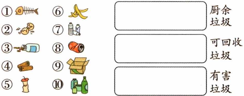廚余垃圾是易腐爛的生活廢棄物,①魚骨、②蝦殼、⑥香蕉皮屬于廚余垃圾;可回收垃圾是適宜回收利用的生活垃圾,⑦紙張、⑧飲料瓶、⑨紙箱、⑩塑料瓶屬于可回收垃圾;有害垃圾是對人體健康或自然環境有害的生活垃圾,③廢電池、④廢燈管屬于有害垃圾。