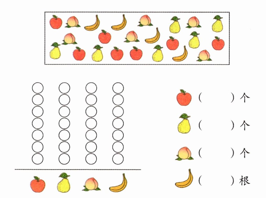 先按蘋果、梨、桃、香蕉的順序,一個一個數出每種水果的數量,蘋果有6個,梨有5個,桃有6個,香蕉有4根。再根據數量在對應的格子里涂色(每個格子代表1個)。