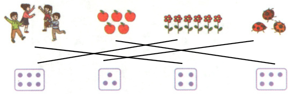 先數出圖中小朋友有4個,蘋果有5個,花有6朵,瓢蟲有3只;再將數量與對應的骰子點數(4、5、6、3)相連。