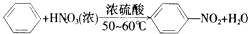 ②苯與濃硝酸、濃硫酸混和后加熱至50℃~60℃發生取代反應,生成硝基苯和水,該反應為